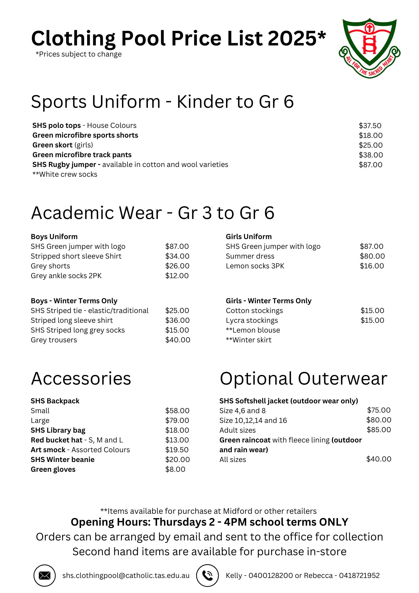At Sacred Heart we are proud to provide a fully stocked Uniform Shop providing all your uniform needs from Kinder to Grade Six. Quality clothing items and accessories are sourced from reputable companies such as Midford, Perm-a-Pleat, Spartan, LW Reid, TasTex, Tasmanian Uniform Emporium.